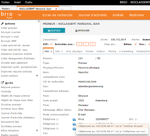 Lorsque vous vous trouvez sur la fiche d’un de vos clients, vous avez la possibilité de lancer l’appel téléphonique directement via BRIO! Lorsque celui-ci est lancé, l’appel se réalise automatiquement via votre téléphone (ou softphone).